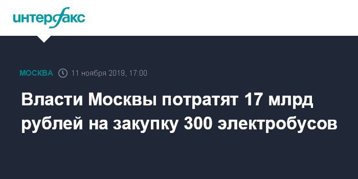 Москва. 11 ноября. INTERFAX.RU - Департамент по конкурентной политике Москвы объявил два конкурса на поставку 300 электробусов для нужд "Мосгортранса" на 17 млрд руб., следует из материала портала госзакупок.