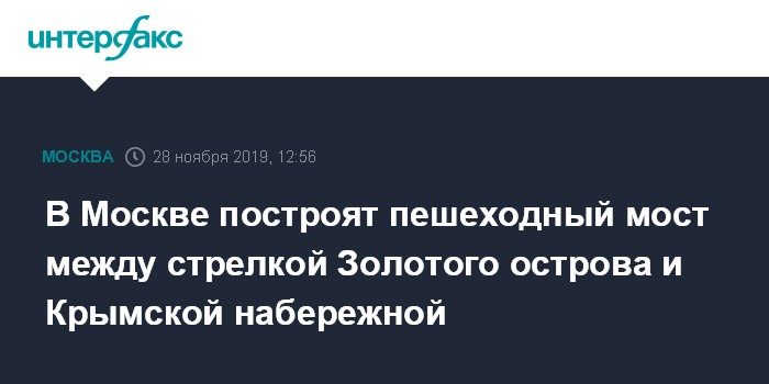 Москва. 28 ноября. INTERFAX.RU - Пешеходный мост построят в центре столицы через Водоотводный канал Москвы-реки, соединяющий стрелку Золотого острова и Крымскую набережную. Такое решение приняла градостроительно-земельная комиссия Москвы.