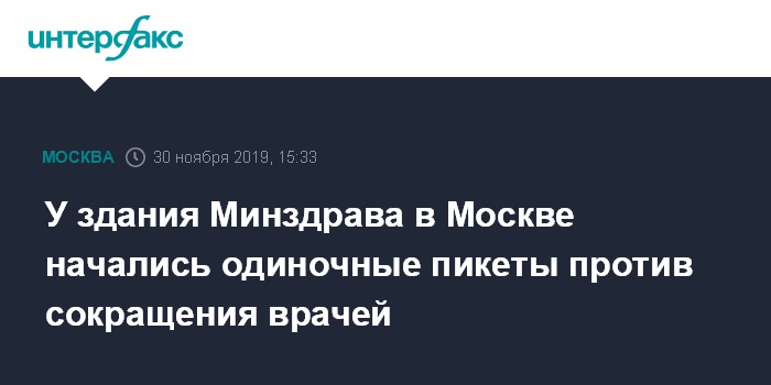 Москва. 30 ноября. INTERFAX.RU - У здания Минздрава России в Москве в субботу проходит серия одиночных пикетов против проведения оптимизации в медучреждениях и сокращения врачей в больницах.