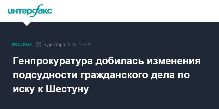 5 декабря Московский областной суд поддержал ходатайство Генпрокуратуры об изменении территориальной подсудности гражданского дела по иску к Шестуну и другим соответчикам об обращении в доход государства незаконно нажитого имущества стоимостью 1 млрд рублей, сообщили "Интерфаксу" в четверг в надзорном ведомстве.