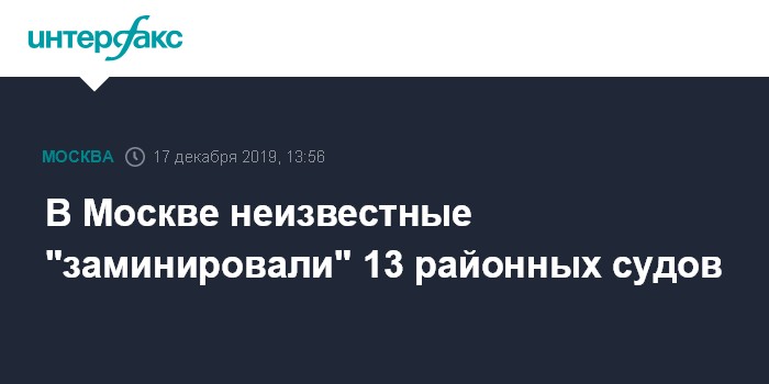 Москва. 17 декабря. INTERFAX.RU - В Москве во вторник поступили угрозы о "минировании" 13 районных судов, из них пришлось эвакуировать в общей сложности около тысячи человек, сообщили в пресс-службе Мосгорсуда.