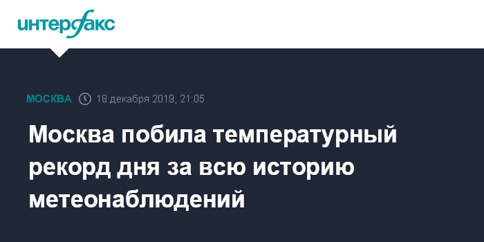Москва. 18 декабря. INTERFAX.RU - В Москве в среду был установлен температурный рекорд дня за всю историю метеонаблюдений, сообщили в столичном метеобюро. Непрерывные наблюдения за погодой в городе ведутся с 1879 года.