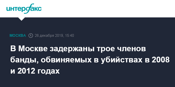 Москва. 26 декабря. INTERFAX.RU - В Москве задержано трое членов преступной группы, обвиняемых в убийствах в 2008 и 2012 годах, планируется их арест, сообщила представитель столичного главка Следственного комитета РФ (СКР) Юлия Иванова.