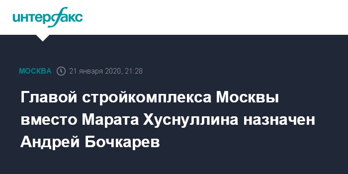 Ранее во вторник стало известно, что Марат Хуснуллин, ранее занимавший пост заместителя мэра Москвы по вопросам строительства, назначен вице-премьером РФ.