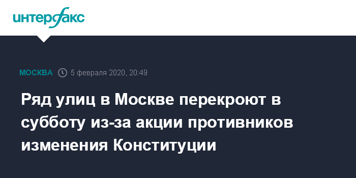 Москва. 5 февраля. INTERFAX.RU - Из-за шествия по вопросу изменения Конституции РФ движение на ряде улиц Москвы в районе метро "Братиславская" на юго-востоке столицы в субботу, 8 февраля, будет перекрыто.