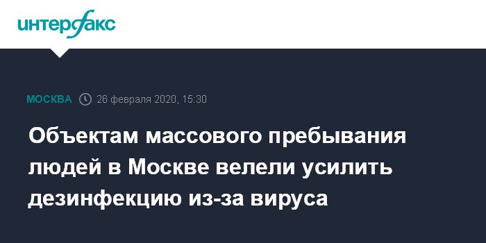 Москва. 26 февраля. INTERFAX.RU - Роспотребнадзор предписал владельцам массовых, культурных, транспортных и спортивных объектов в Москве усилить дезинфекционный режим.