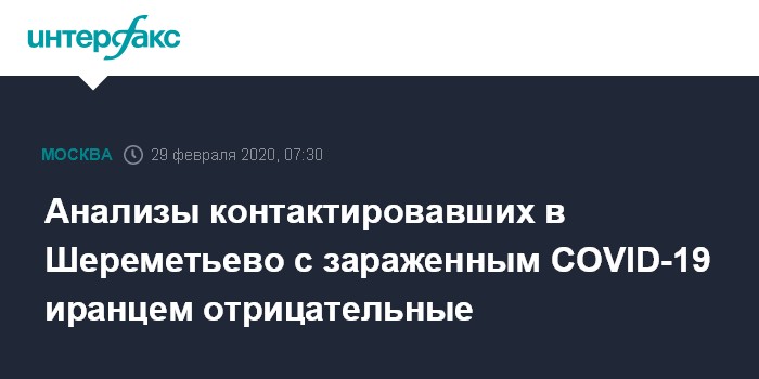 Москва. 29 февраля. INTERFAX.RU - Результаты анализов пятерых человек, которые были госпитализированы после контакта с зараженным коронавирусом COVID-19 гражданином Ирана в Шереметьево, показали отрицательный результат, сообщили "Интерфаксу" в оперативном штабе по мониторингу и контролю ситуации с коронавирусом.