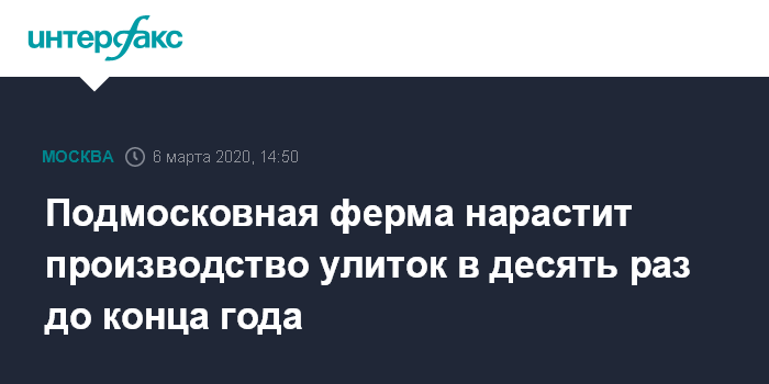 Москва. 6 марта. INTERFAX.RU - К концу 2020 года производитель улиток из Коломны "Экодеревушка" планирует увеличить выпуск товара в десять раз, сообщили в Минсельхозпроде Подмосковья.