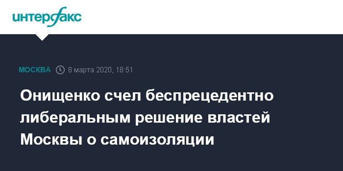 "Мэрия Москвы приняла беспрецедентное в своей либеральности решение, потому что меня в данной ситуации, как гражданина Москвы, видят в качестве союзника. Говорят - вы прилетели из Италии, там неблагополучная ситуация, вы можете пожить у себя, если живете один, но не выходите из квартиры. То есть мне доверились, попросили не нарушать режим", - сказал Онищенко "Интерфаксу".