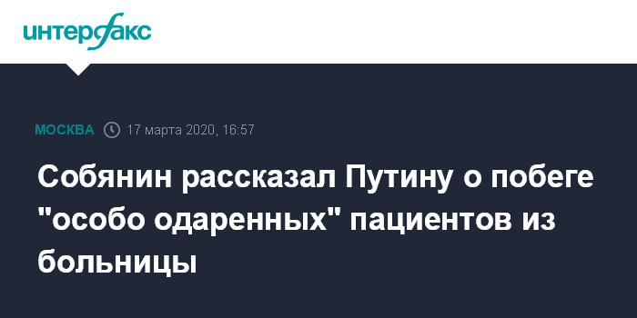 Москва. 17 марта. INTERFAX.RU - Мэр Москвы Сергей Собянин рассказал президенту РФ Владимиру Путину об инциденте с пациентами, которые самовольно покинули больницу в Коммунарке.