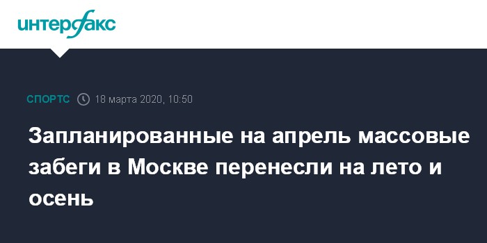 "В связи с указом Мэра Москвы Сергея Собянина о запрете проведения на территории города Москвы спортивных, зрелищных, публичных и иных массовых мероприятий до 10 апреля 2020 года, а также с угрозой распространения коронавируса (COVID-19), команда "Бегового сообщества" перенесла первые массовые старты сезона", - сообщили "Интерфаксу" в пресс-службе "Бегового сообщества".