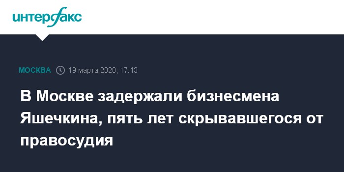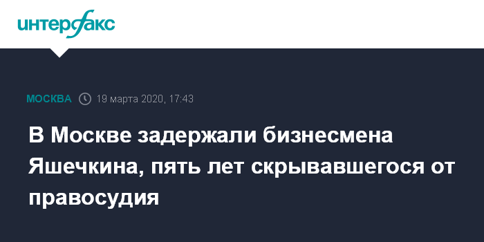Москва. 19 марта. INTERFAX.RU - Сотрудники Федеральной службы исполнения наказаний (ФСИН) задержали бывшего председателя совета директоров оператора коммунального водоснабжения ОАО "Евразийский" Сергея Яшечкина, объявленного в 2015 году в розыск после того, как он был осужден за мошенничество.