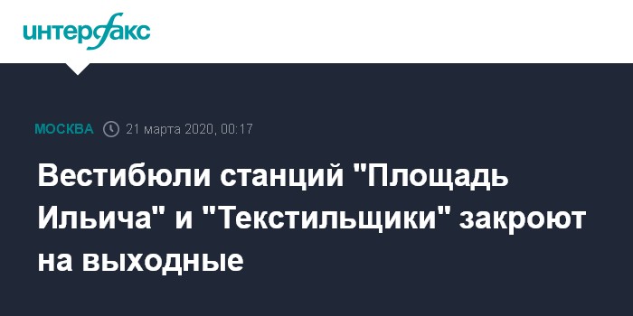 Москва. 21 марта. INTERFAX.RU - В субботу и воскресенье для пассажиров будут закрыты вестибюль станции "Площадь Ильича" Калининской линии и восточный вестибюль станции "Текстильщики" Таганско-Краснопресненской линии Московского метрополитена, сообщили "Интерфаксу" в пресс-службе подземки.