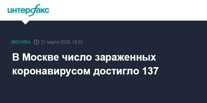 Москва. 21 марта. INTERFAX.RU - Общее число выявленных в Москве случаев заболевания новой коронавирусной инфекцией за последние сутки выросло на шесть - до 137, сообщили "Интерфаксу" в субботу в столичном оперативном штабе по контролю и мониторингу ситуации с коронавирусом.