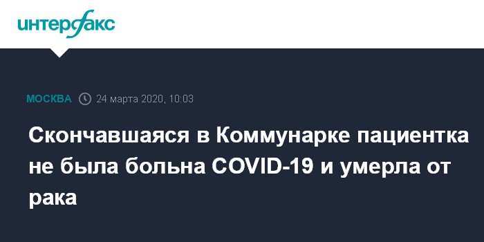 Москва. 24 марта. INTERFAX.RU - Скончавшаяся в больнице в Коммунарке женщина не была больна коронавирусом нового типа, сообщает депздрав Москвы.