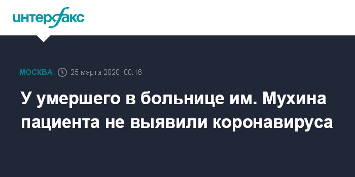 "Департамент здравоохранения Москвы по факту сообщений в СМИ о смерти пациента в больнице им. Мухина выступает с официальным разъяснением. В больницу им. Мухина пациент поступил с диагнозом пневмония. Однако причиной смерти стала недостаточность внутренних органов на фоне нескольких заболеваний - пневмония не была среди них ведущим. Результат анализа на новую коронавирусную инфекцию - отрицательный", - сообщили "Интерфаксу" в департаменте здравоохранения Москвы.