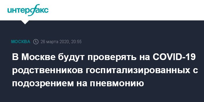Москва. 26 марта. INTERFAX.RU - Тестированием на коронавирус охватят родственников жителей Москвы, которых госпитализировали с подозрением на пневмонию, сообщила заместитель мэра столицы по вопросам социального развития Анастасия Ракова.