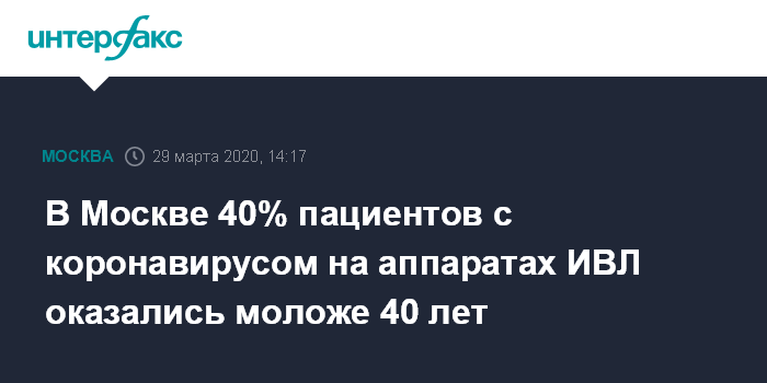 По словам собеседника агентства, почти 40% пациентов с коронавирусом в Москве, которые находятся на искусственной вентиляции легких, моложе 40 лет.