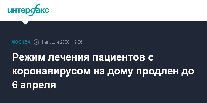 Москва. 1 апреля. INTERFAX.RU - Режим лечения пациентов с коронавирусом на дому продлен до понедельника, сообщила заместитель мэра Москвы по вопросам социального развития Анастасия Ракова.