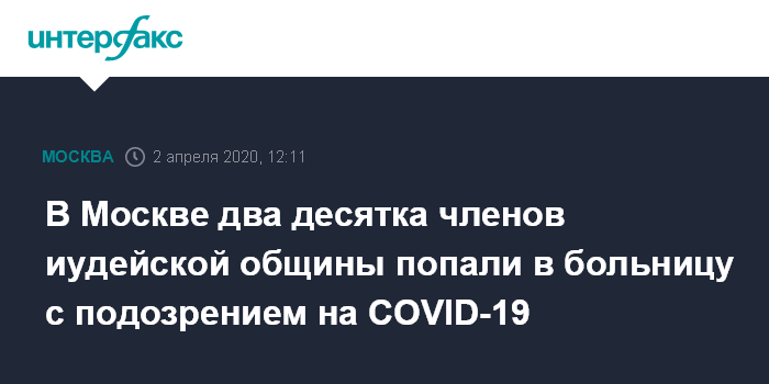 Москва. 2 апреля. INTERFAX.RU - В Москве около 20 членов иудейской общины госпитализированы с подозрением на коронавирус и еще около десятка семей находятся на домашнем карантине, сообщили в пресс-службе Федерации еврейских общин России.
