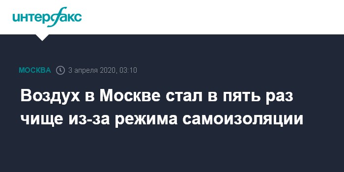Москва. 3 апреля. INTERFAX.RU - Введение режима самоизоляции в Москве позволило в пять раз снизить количество загрязняющих веществ в воздухе, при этом ситуация будет улучшаться с каждым днем, сообщает в пятницу газета "Известия".