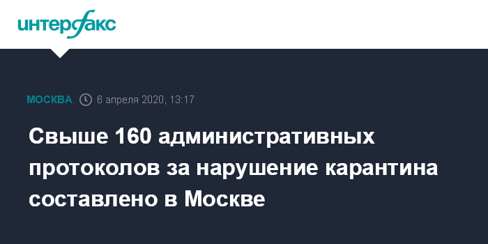 Москва. 6 апреля. INTERFAX.RU - В Москве выписано уже более 160 протоколов по административным правонарушениям, связанным с нарушением режима самоизоляции, сообщил начальник управления информации и общественных связей Главного управления МВД России по Москве Владимир Васенин.