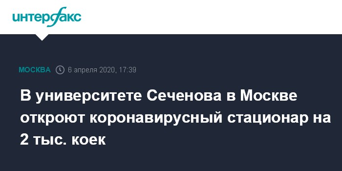 Кроме того, 13 апреля на базе Сеченовского университета планируется развернуть еще 1,3 тыс. коек, в том числе 500 коек в университетской клинической больнице № 3 (клиника нервных болезней им. А. Я. Кожевникова и корпус им. Е. М. Тареева); 800 коек в университетской клинической больнице № 1.