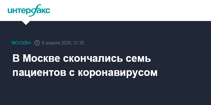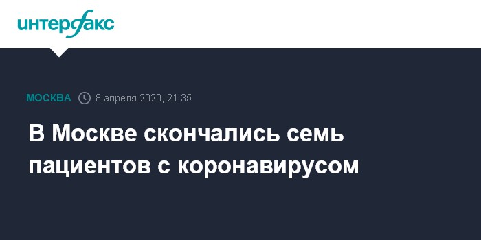 "В Москве скончались семь пациентов, у которых был подтвержден диагноз пневмония и получен положительный результат тестов на коронавирусную инфекцию. Среди них - люди в возрасте от 46 до 90 лет", - сказал собеседник агентства.
