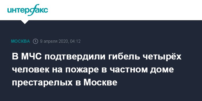 Москва. 9 апреля. INTERFAX.RU - В МЧС России подтвердили гибель четырех человек в результате пожара в частном доме престарелых на западе Москвы.