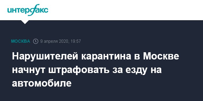 Москва. 9 апреля. INTERFAX.RU - Жителей Москвы, нарушающих карантин по коронавирусу и передвигающихся на личных автомобилях, с 10 апреля начнут штрафовать, сообщает в четверг столичный оперативный штаб по контролю и мониторингу ситуации с коронавирусом со ссылкой на мэра столицы Сергея Собянина.