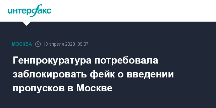 Москва. 10 апреля. INTERFAX.RU - Генпрокуратура обнаружила новые фейки о коронавирусе в интернете, среди них - сообщения о введении режима пропусков в Москве на время карантина и "госперевороте", происходящем в России.