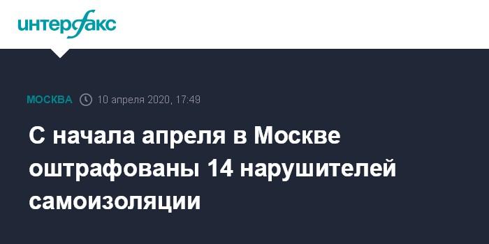 Москва. 10 апреля. INTERFAX.RU - Еще пять жителей Москвы оштрафованы за нарушение режима самоизоляции, сообщила "Интерфаксу" в пятницу пресс-секретарь Мосгорсуда Ульяна Солопова; таким образом, с начала апреля в столице за данное правонарушение наказали уже 14 человек.