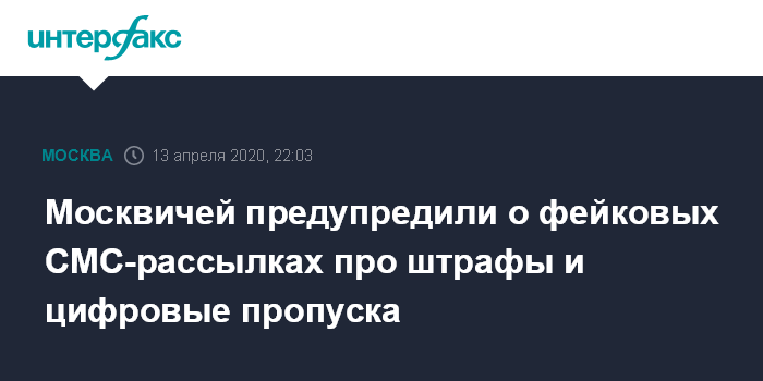 Москва. 13 апреля. INTERFAX.RU - В московском управлении полиции призвали жителей столицы не доверять СМС-рассылкам с требованиями оплатить штрафы и приобрести цифровые пропуска для передвижения по городу через третьих лиц на фоне пандемии коронавируса.