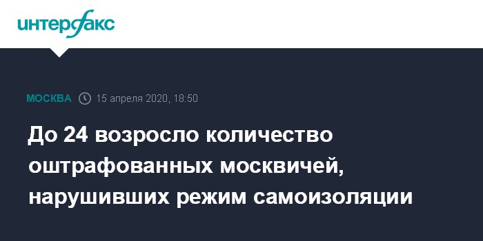 9 апреля Солопова сообщала "Интерфаксу", что в столице были выписаны первые девять штрафов за нарушения режима самоизоляции. Все нарушители были оштрафованы на 15 тыс. рублей по статье 6.3 КоАП.