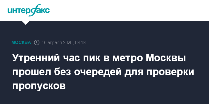 Москва. 16 апреля. INTERFAX.RU - Час пик в московском метро в четверг пройден успешно, скопления пассажиров из-за проверки пропусков на передвижение не было, теперь эти проверки носят выборочный характер, сообщили "Интерфаксу" в пресс-службе департамента транспорта Москвы.
