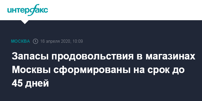 Москва. 16 апреля. INTERFAX.RU - В торговых сетях и магазинах столицы созданы запасы продовольствия и продукции на 30-45 дней, сообщил руководитель департамента торговли и услуг правительства Москвы Алексей Немерюк.