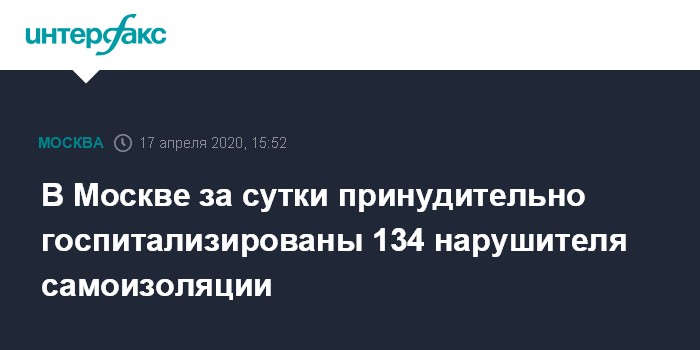 Москва. 17 апреля. INTERFAX.RU - В столице за прошедшие сутки 134 нарушителей самоизоляции были принудительно госпитализированы. Об этом сообщили в пресс-службе Главного контрольного управления Москвы.