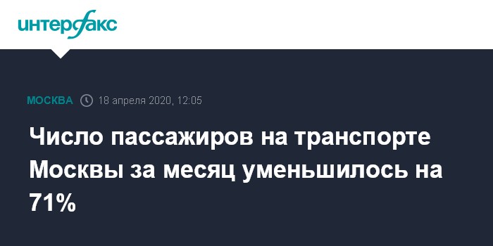 Москва. 18 апреля. INTERFAX.RU - Общее количество людей, передвигающихся по Москве на всех видах транспорта, за месяц снизилось на 71%, сообщила в субботу пресс-служба департамента транспорта столицы со ссылкой на заммэра Максима Ликсутова.