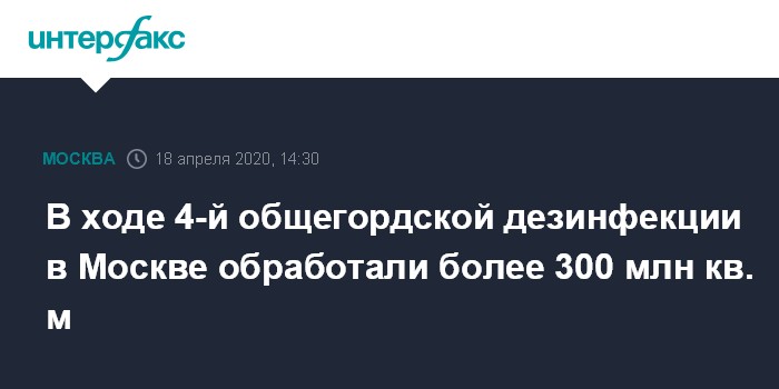Москва. 18 апреля. INTERFAX.RU - В столице завершилась четвертая по счету масштабная дезинфекция всех дорог и общественных пространств, сообщил заместитель мэра Москвы Петр Бирюков журналистам.