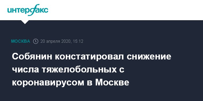 Москва. 20 апреля. INTERFAX.RU - Прирост тяжелобольных коронавирусом в Москве стабилизировался, система здравоохранения входит в плановый режим работы, заявил мэр столицы Сергей Собянин.