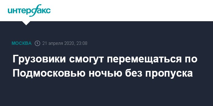Москва. 21 апреля. INTERFAX.RU - Для передвижения на территории Подмосковья грузовиков с 22:00 до 6:00 не потребуется оформление электронного пропуска.