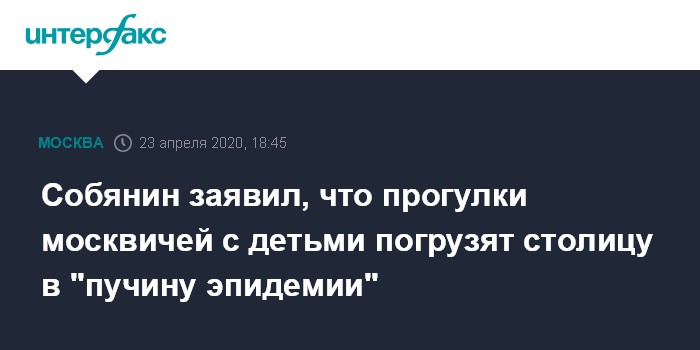 Москва. 23 апреля. INTERFAX.RU - Мэр Москвы Сергей Собянин считает, что разрешать жителям столицы гулять с детьми даже рядом со своим домом нельзя - это приведет к драматическому распространению коронавирусной инфекции.