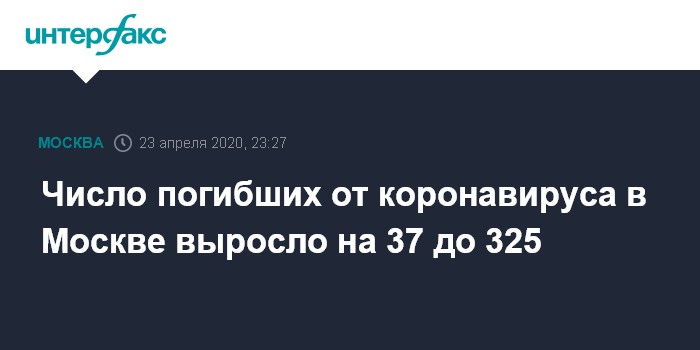 Москва. 23 апреля. INTERFAX.RU - За последние сутки в Москве умерло 37 человек с подтвержденным диагнозом коронавирус и пневмония, а общее число скончавшихся в городе с COVID-19 достигло 325, сообщили "Интерфаксу" в столичном оперативном штабе по контролю за коронавирусом в четверг.