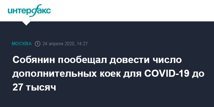 "В Москве по нормативу надо было развернуть 12 тыс. коечного фонда. Сегодня уже развернуто 16 тыс . В ближайшие дни развернем до 20 тыс. - и дальше до 27 тыс., - сказал он. - Мы видим, что помимо этого необходимо разворачивать дополнительные мощности. Бесконечно забирать из медицины (коечный фонд), занимающейся другими вопросами, невозможно. Поэтому мы приняли решение о разворачивании временных сооружений на 5 000 коек возле высокотехнологичных клиник, таких как Коммунарка, 58-я клиническая больница и других".