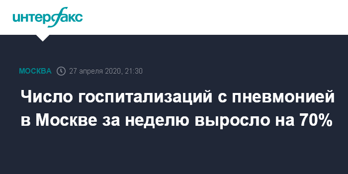 Москва. 27 апреля. INTERFAX.RU - В Москве за последнюю неделю на 70% увеличилось число госпитализаций с пневмонией, сообщила заммэра столицы по вопросам социального развития Анастасия Ракова.