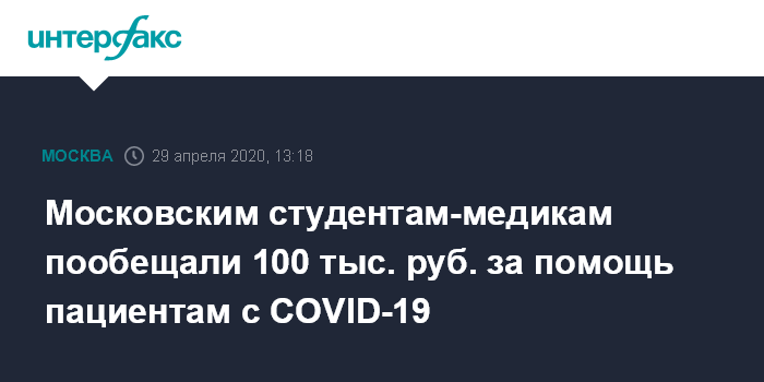 24 апреля Собянин попросил премьер-министра Михаила Мишустина подготовить приказ о том, что студенты 4-го и 5-го курсов медицинских вузов должны быть направлены на практику в больницы, где лечат заболевших COVID-19.