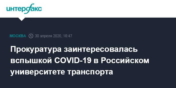 Москва. 30 апреля. INTERFAX.RU - Московская межрегиональная транспортная прокуратура организовала проверку по факту вспышки коронавирусной инфекции в Российском университете транспорта (РУТ), сообщили "Интерфаксу" в четверг в надзорном ведомстве.