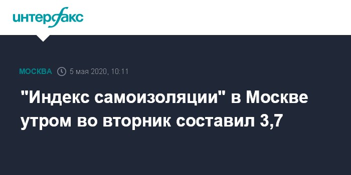 По данным сервиса, индекс самоизоляции в Москве на 9:00 составляет 3,7.