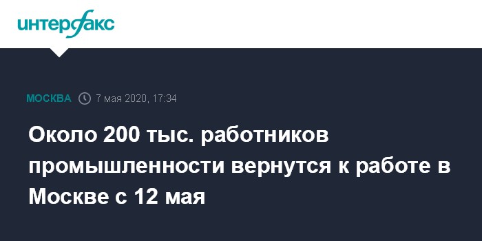 О том, что в Москве с 12 мая возобновят работу промышленные предприятия и стройки, стало известно ранее в четверг.