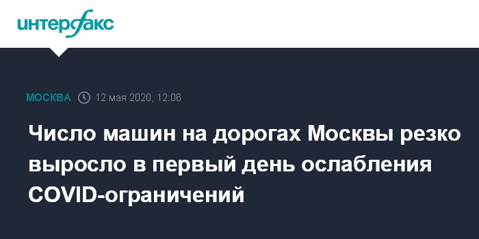 Москва. 12 мая. INTERFAX.RU - В первый день ослабления ограничений в связи с режимом повышенной готовности на дорогах Москвы почти на 200 тыс. выросло число автомобилей, сообщили "Интерфаксу" в пресс-службе департамента транспорта столицы.